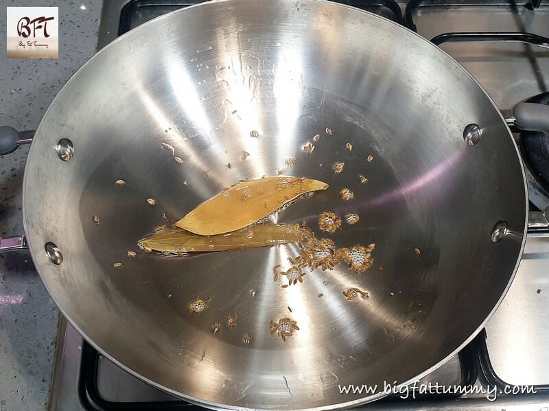 Step 3:     Heat 4 tbsp. oil in a pan and add the cumin seeds, bay leaves, cinnamon and cloves and sauté for a few seconds on medium heat.