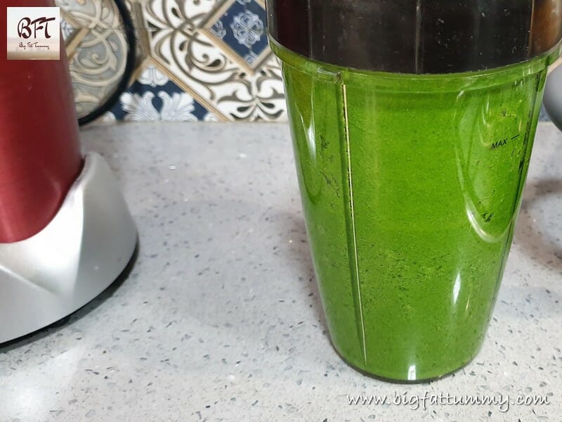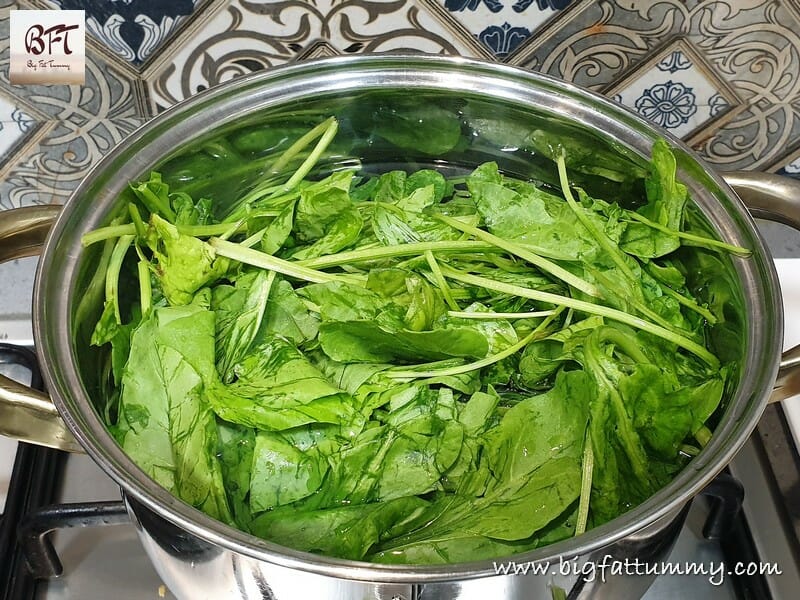 Step 3:     Blanch the palak leaves in boiling water for 5 minutes (click here for reference) and then transfer the leaves to a vessel with ice cold water. When cooled, make a puree of the leaves and keep aside.