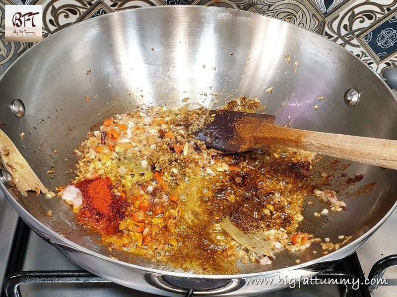 Step 5:     Add the crushed ginger and garlic and sauté for a few seconds. Add the green chillies, corriander powder, chilly powder and chana/chole masala powder, ½ tsp. salt and sauté for 30 seconds on low heat. Add 2 tbsp. water and saute for another 2 minutes on low heat.
