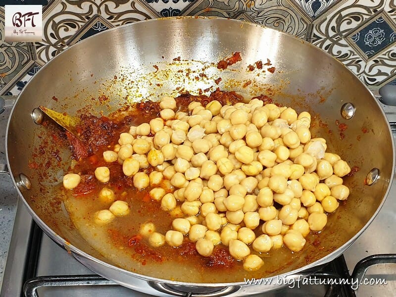Step 7:     Add the chole and 2 cups of its broth (the liquid it was cooked in) and cook on medium heat for 10 minutes till the gravy thickens.
