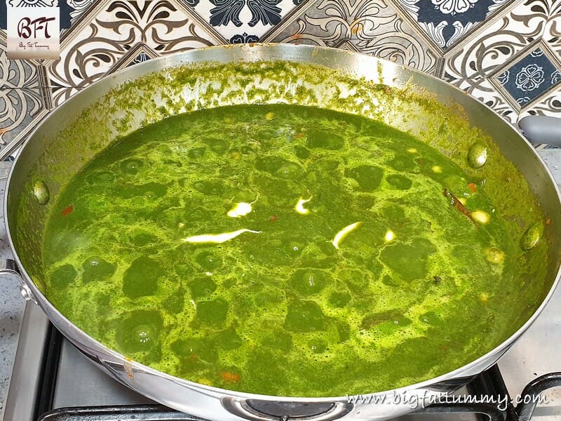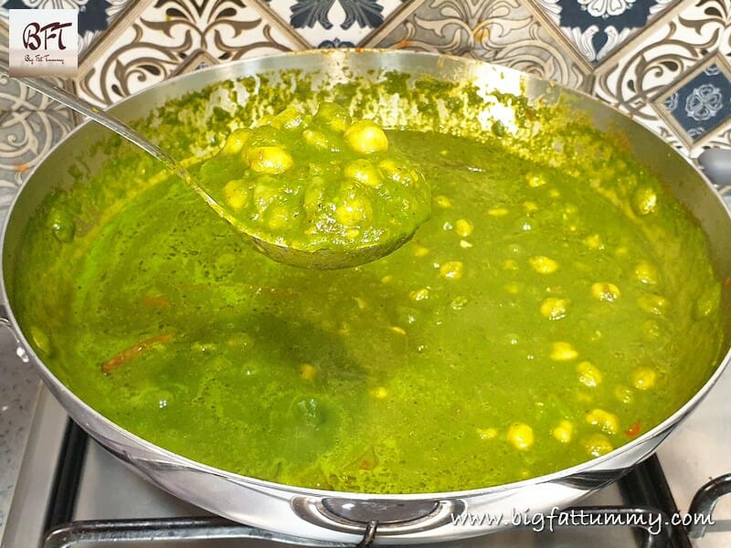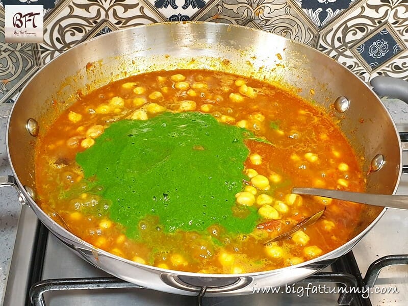 Step 8:     Add the palak puree and mix. Check for salt and add if required. Cover and cook for another 8 to 10 minutes on low heat.Preparation of Palak Chole