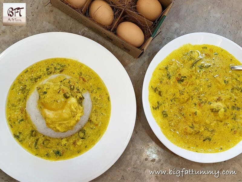 Step 4: Now add the spiced coconut milk, 1 tsp. salt and bring to a boil on medium heat. Add the corriander leaves and the stock cube and mix. Reduce the heat and break an egg and drop in gently into the curry. Do this for all the eggs one at a time and release at different places in the vessel. Cook on low heat for four minutes till the eggs are set.