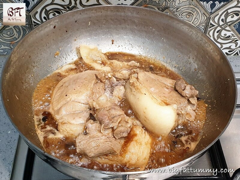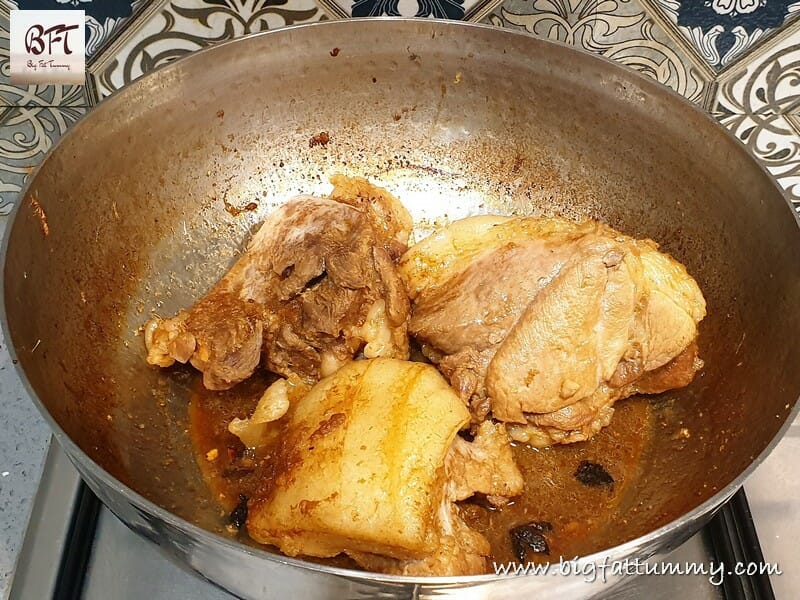 Step 3: Take the marinated meat in a vessel and add ½ cup water to it. Add the star anise and turn on the heat and cook covered till the meat is fork tender (about 25 to 30 minutes). Then continue cooking without the lid till all the juices dry out. Switch off the heat and allow to cool.