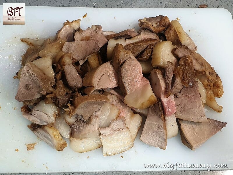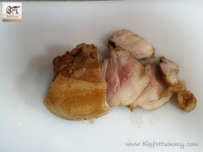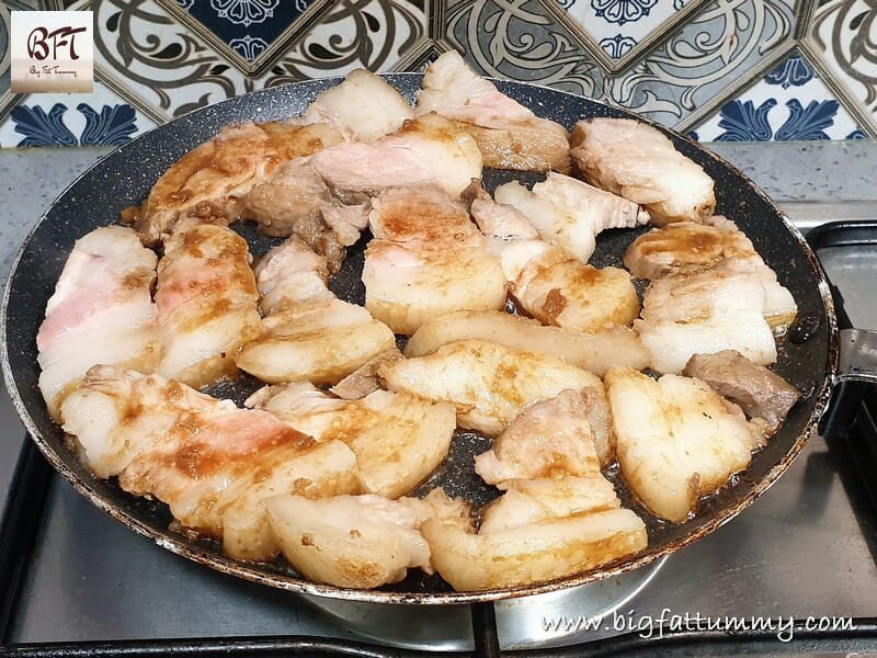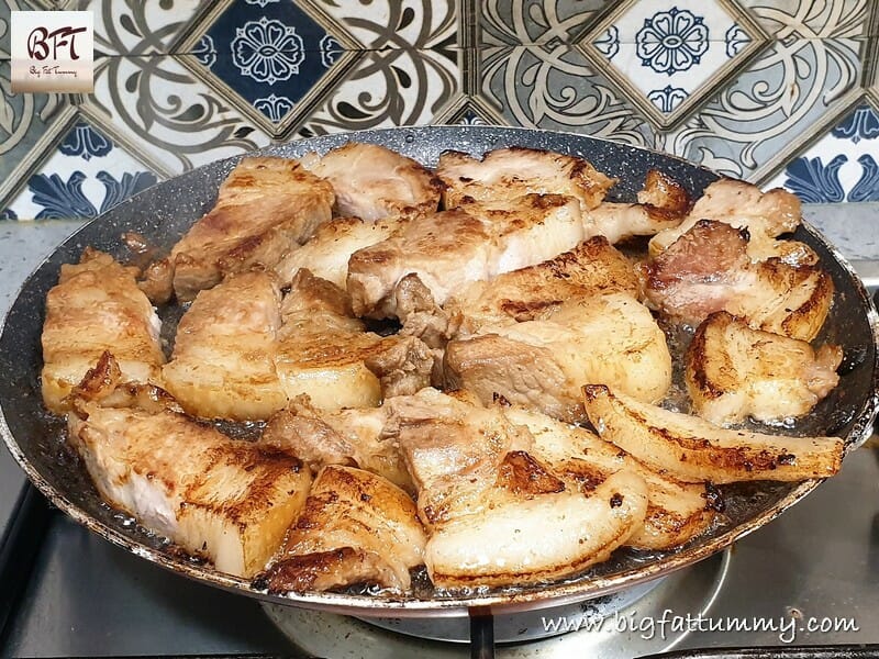 Step 4: Heat 1 tsp. oil on a griddle/pan and fry the pork slices till light golden and then keep aside.