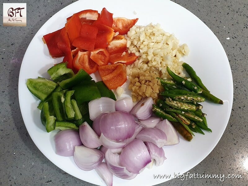 Step 2: Add all the ingredients for the Sauce Mixture in a bowl and keep ready. Also chop and ready all the veggies.