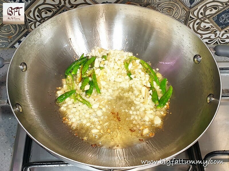 Step 5: In another pan/wok, heat 3 tbsp. of oil and add the chopped ginger and garlic and the green chillies and sauté on low heat for 2 minutes.
