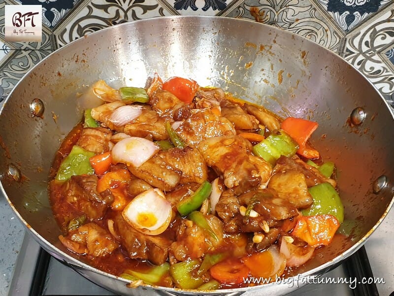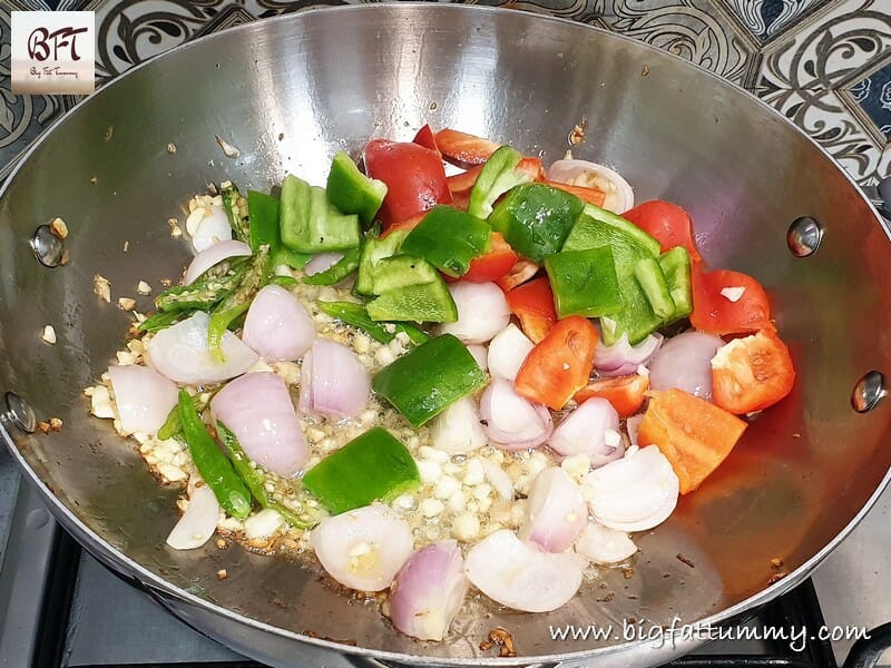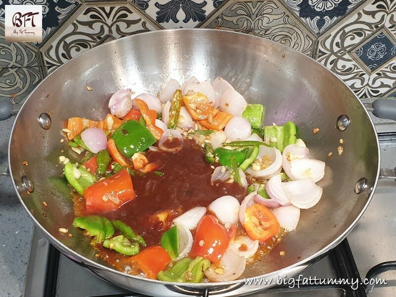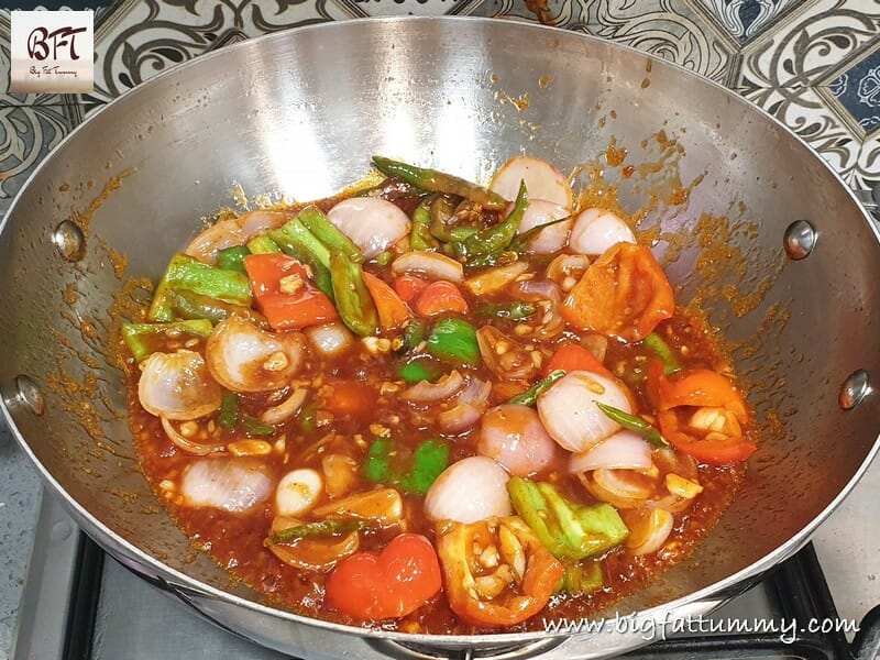 Step 6: Add the cubed onion, capsicum and sauté on high heat for 2 minutes. Then add the Sauce Mixture and sauté for another 2 to 3 minutes on medium heat.