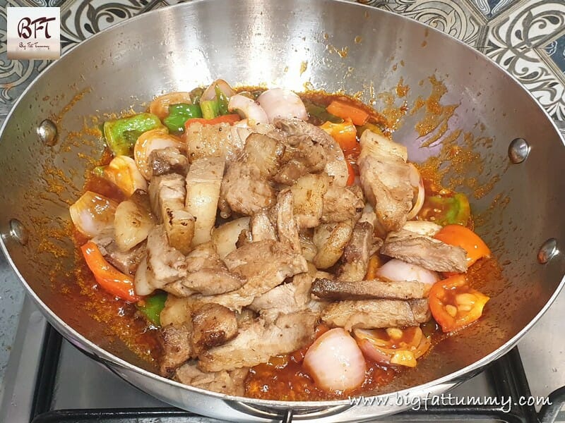 Step 7: Finally add the fried pork slices and give a mix. Check for salt, vinegar, etc. and add if required. Serve hot.