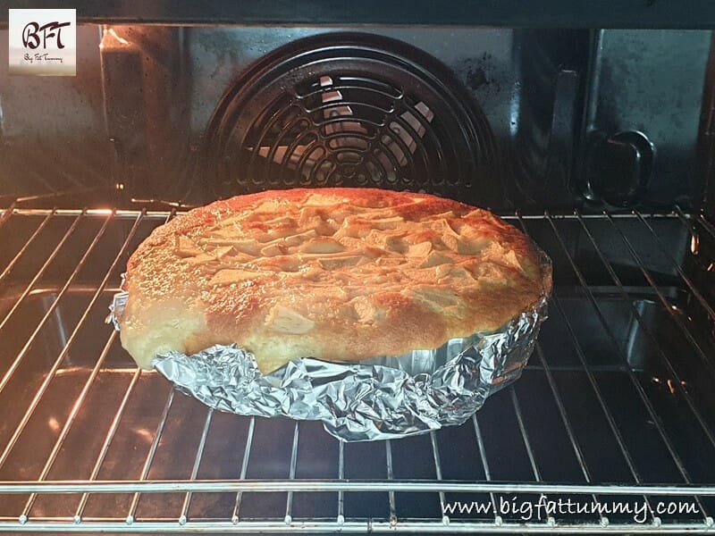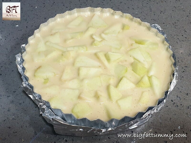 Step 7:     Top the batter with the apple pieces and bake at 170° C for 40 minutes (Check if the cake is ready by inserting a skewer into it. It should come out clean).