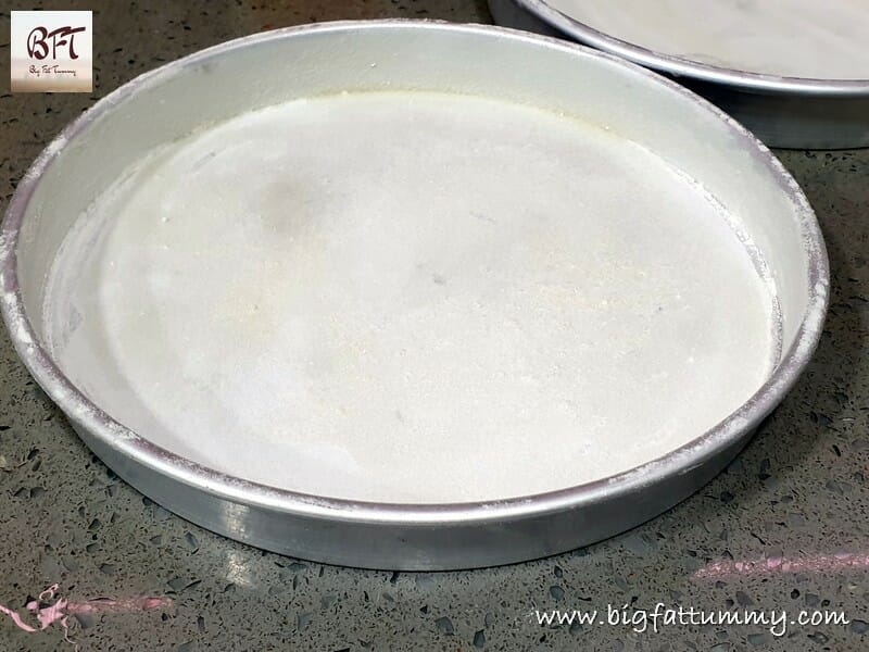 Step 1: Grease and coat four 8 inch diameter flat baking trays with some oil and maida as shown in the picture (check notes).