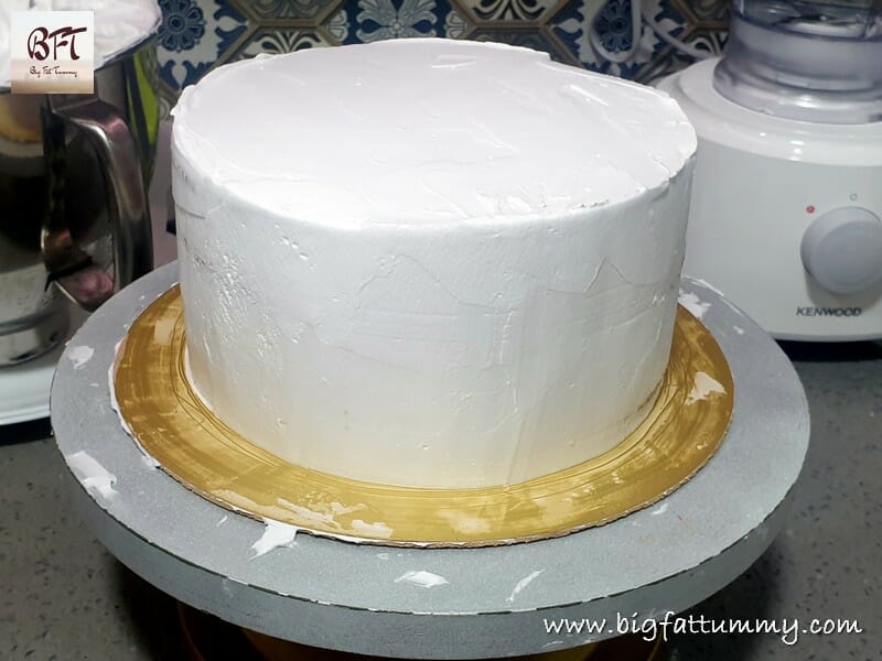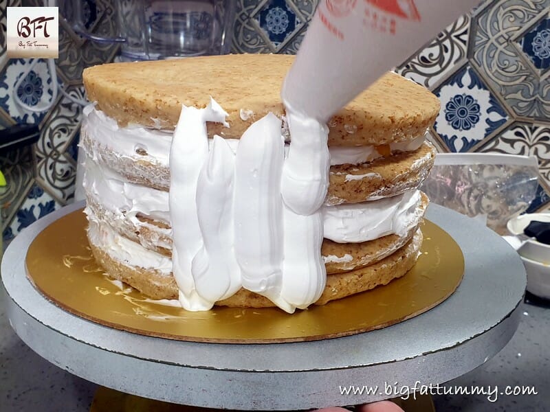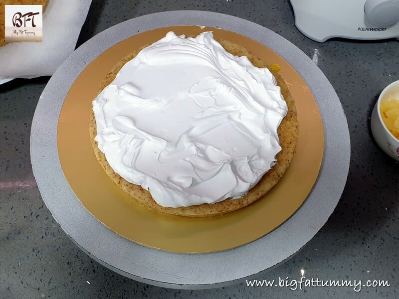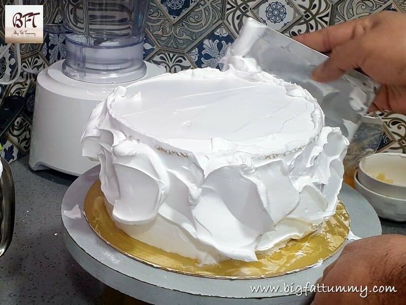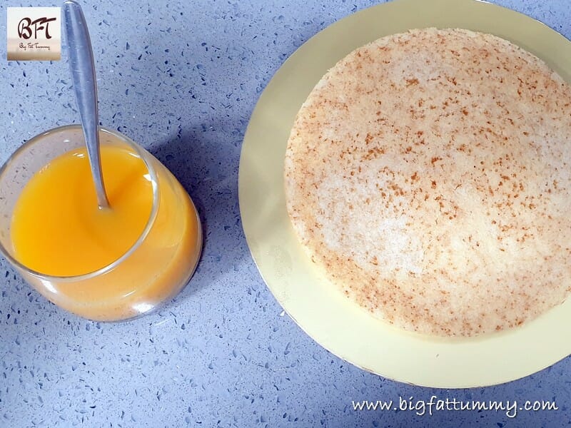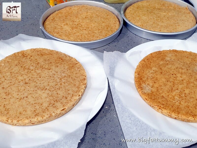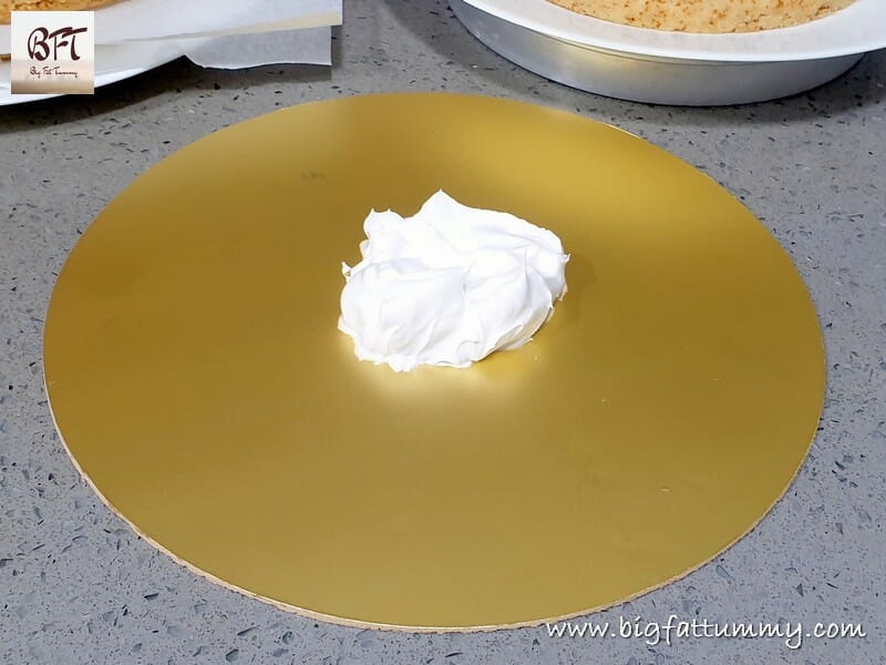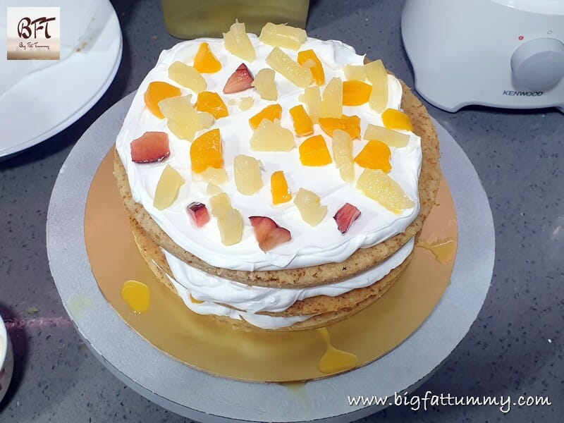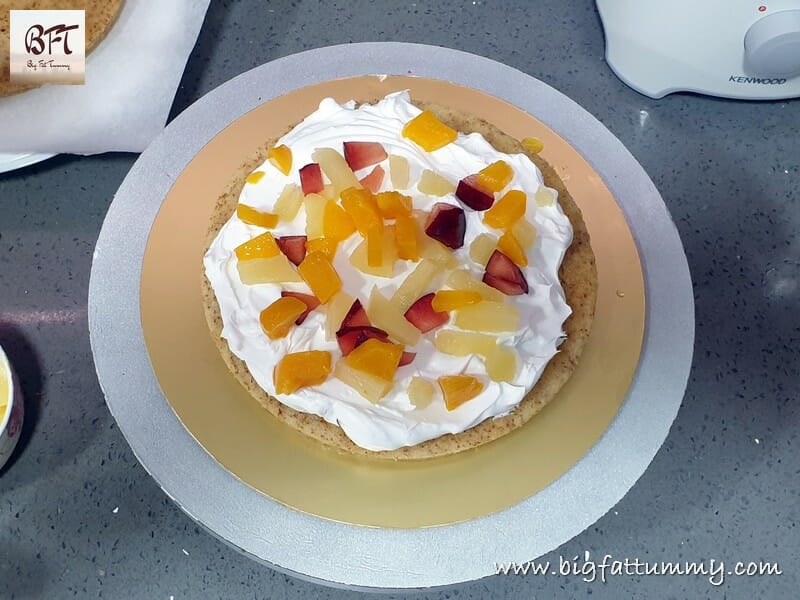 Step 10: Once the cakes have cooled you can assemble them. Take a 10 inch cake board and add a tbsp. of whipped cream on its center. Place a cake on it. Sprinkle some orange juice to moisten the cake. Then spoon some whipped cream onto it and spread. Place some chopped fruits onto it and place another flat cake onto it. Press lightly. Repeat for all the cakes.
