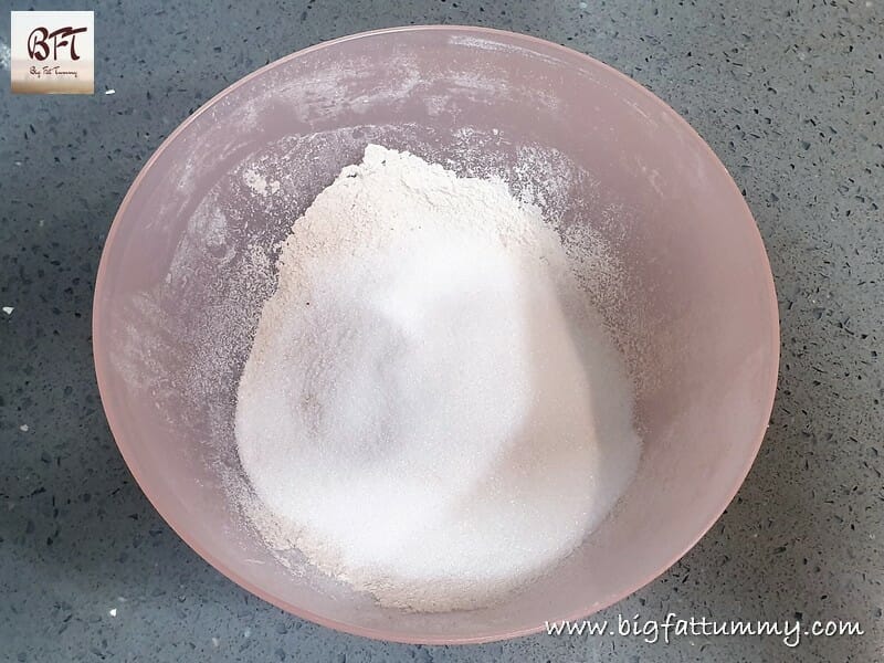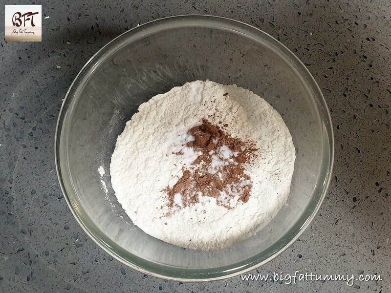 Step 2: Sift the maida, SBC, cocoa and salt in a bowl. Add the castor sugar to this and give a mix. Keep aside.