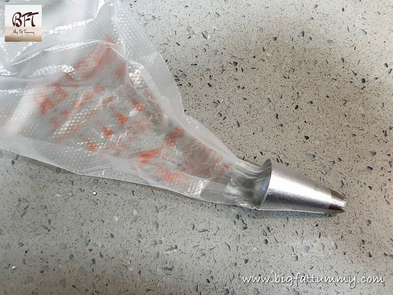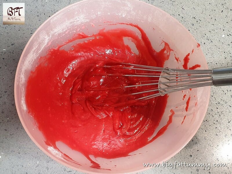 Step 6: Add the wet ingredients to the dry ingredients. Also add the red food colour and fold using a whisk in till a smooth batter is formed (Do it lightly and don’t over mix). Add 2 to 3 tbsp. of milk and fold in if the mixture seems to dry.