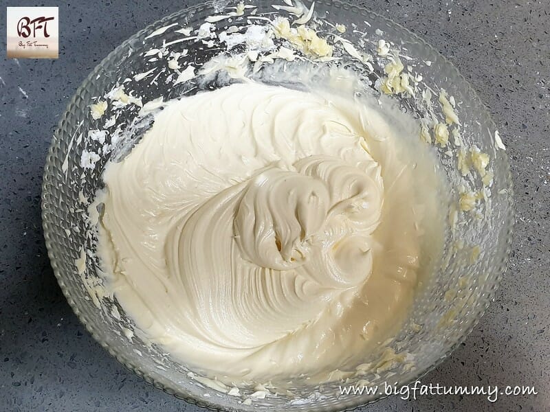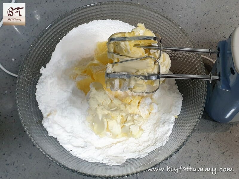 Step 10: Take the sieved icing sugar, the cream cheese and butter and whisk using an electric beater on low speed.
