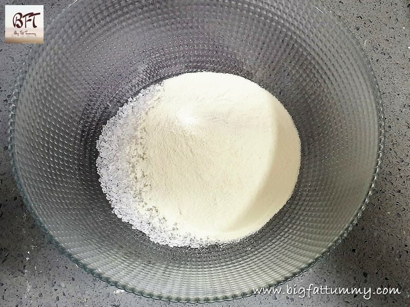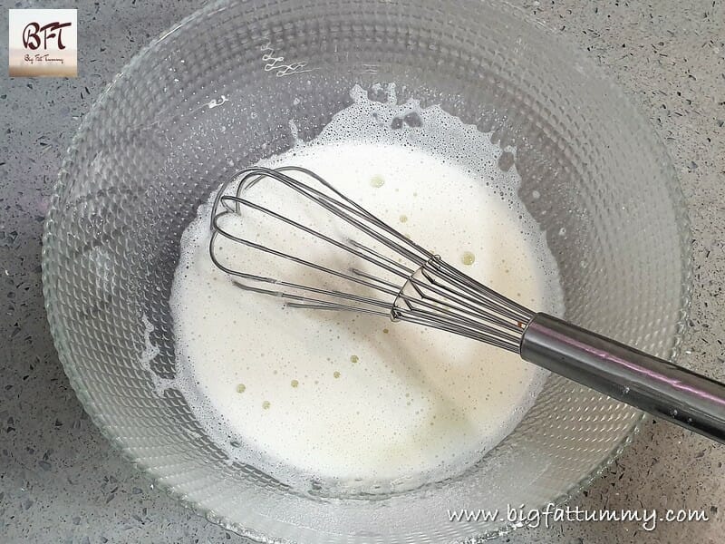 Step 1: Take the sugar and the milk powder in a bowl. Add 135 ml warm water and stir till the sugar dissolves (use a whisk).