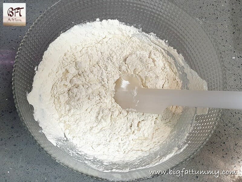 Step 3: Add the baking powder to the maida and mix. Then sieve it using a fine mesh sieve.