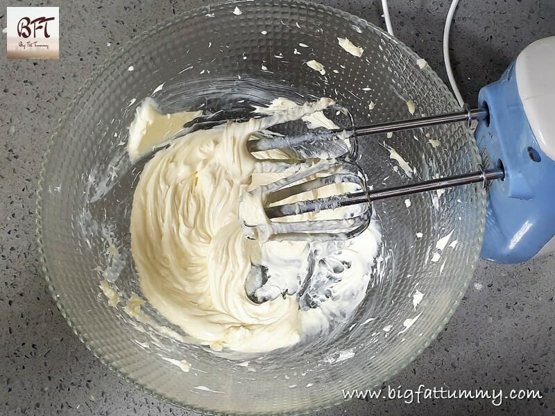Step 3: Take the cream cheese in a bowl and whisk it with an electric beater for a minute. Add the icing sugar and whisk for a further 30 seconds.
