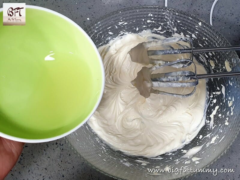 Step 4: Next add the milk cream and continue whisking for a minute. As the mixture thickens and becomes a bit fluffy, add the lime juice and whisk for another few seconds. Finally add the food colour, if using, and whisk for a few more seconds till thick.