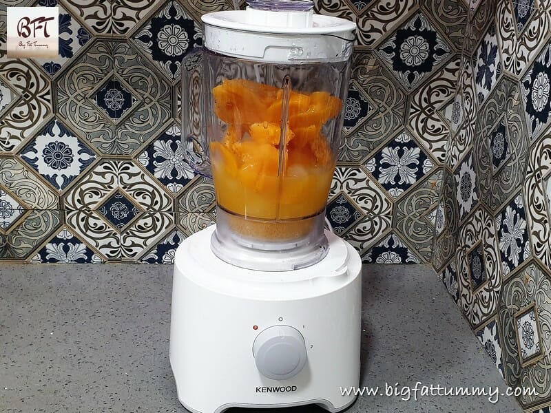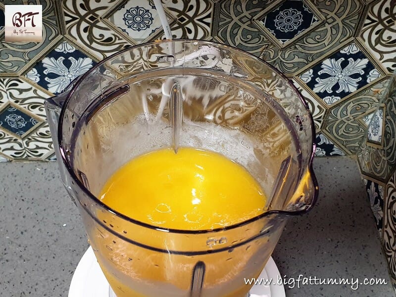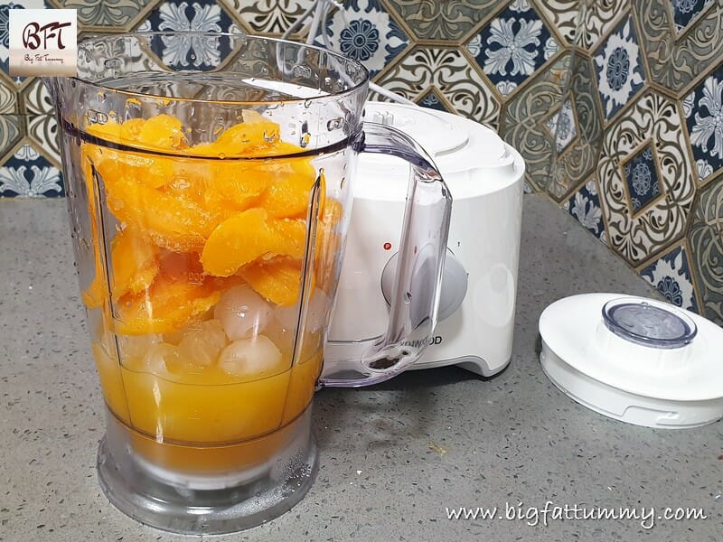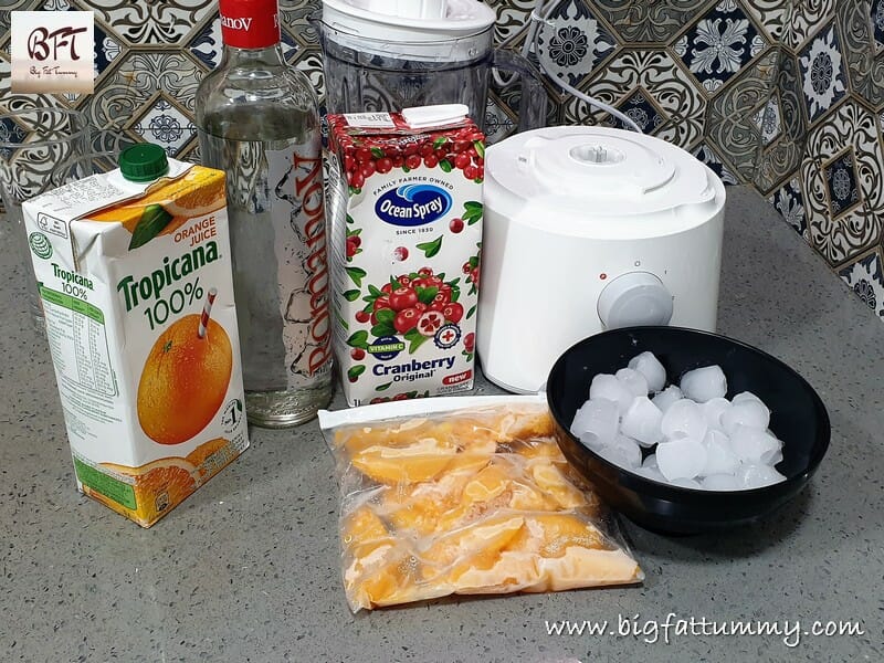 Step 1: Place the frozen peaches, vodka, orange juice and ice in a blender jar (use a juice blender).