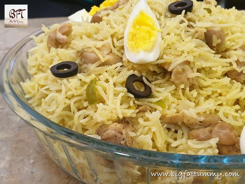 Step 9:     Spread 2 tbsp. of butter over the cooked pulao and keep the pulao half covered for another 10 minutes. Later, fluff the pulao with a fork and transfer to serving bowl. Decorate with the olives and boiled eggs.