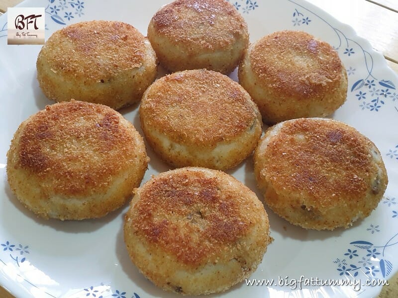 Step 11:     Dip each potato chop in the beaten egg to coat it completely and then coat with the breadcrumbs and proceed to fry them. (To store, place in a single layer in a container / plate and cover with cling film and refrigerate for upto 2 days)