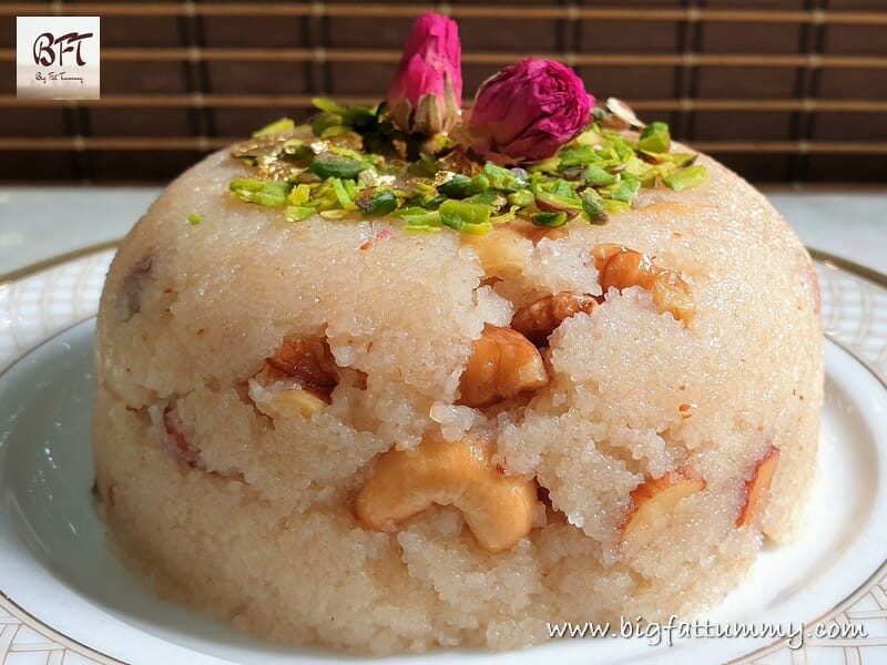 Step 5: (Optional – for garnish and serving) Take a small bowl and add the Dry Fruit Sheera to it to mould. Then turn over on a quarter plate / serving dish to de-mould. Garnish with the chopped pistas, gold varq and rose petals.