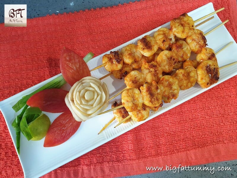 Prawns on a Stick – Goan Style – aka “Goan Prawn Satay” is a simple but fancy prep fully worthy of lining you party buffet table. Looks pretty and tastes yum. You can serve is as a side with drinks too. The recipe needs just a couple of basic masala powders and some fresh prawns.