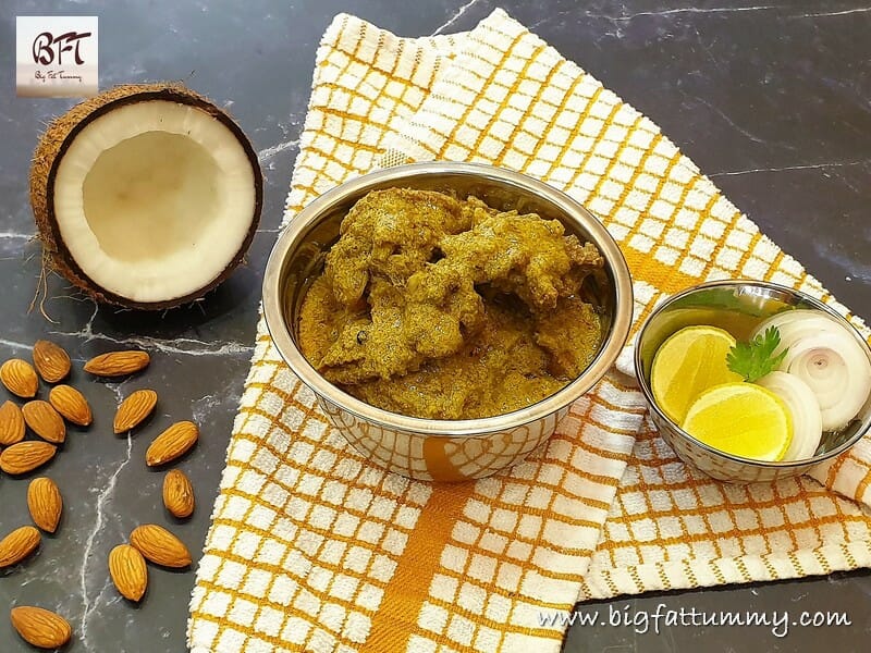 The Mutton Badami Curry is made with a base of coconut and almond thereby reducing the coconut in the curry. It’s a mild and easy to make thick curry and goes well with chapatis.